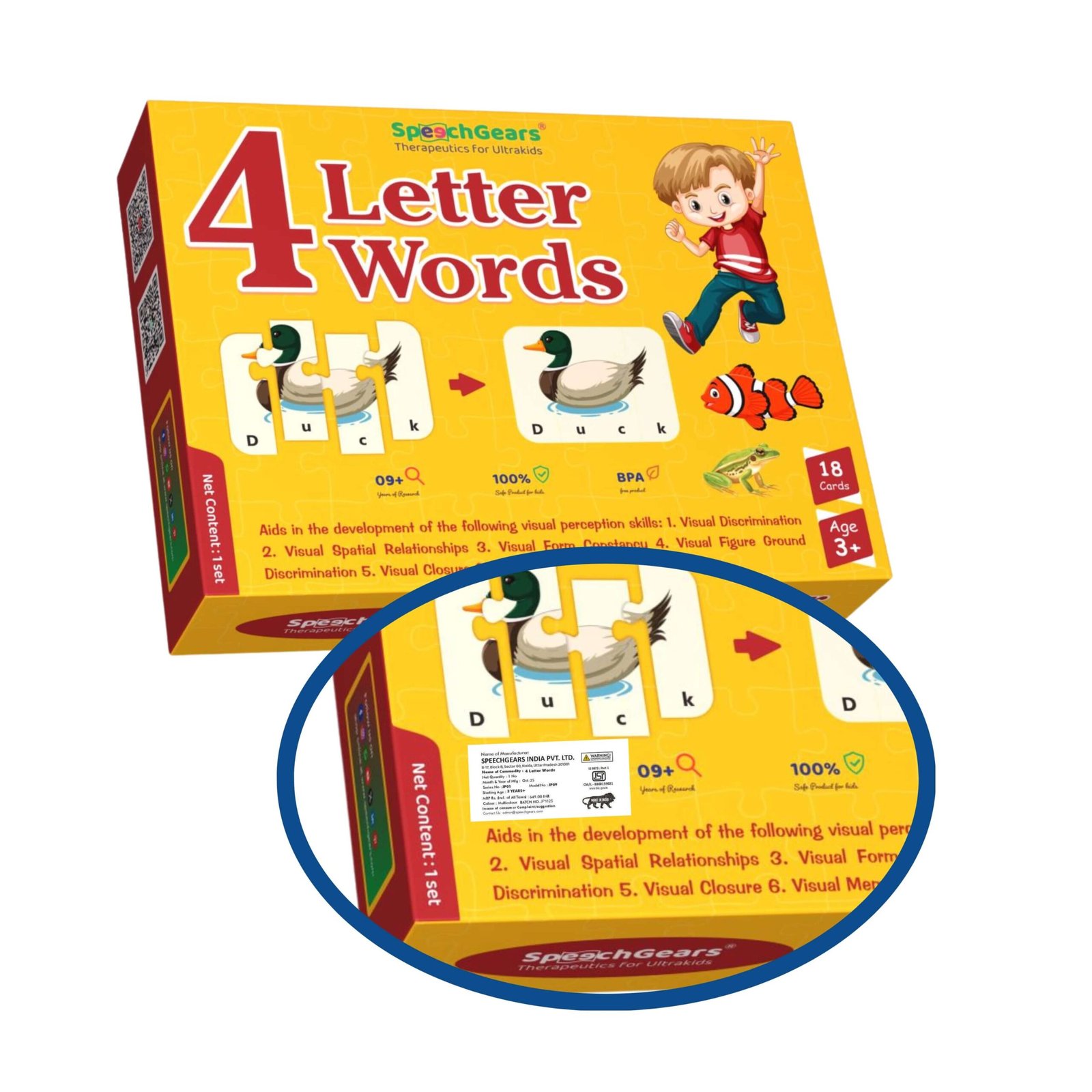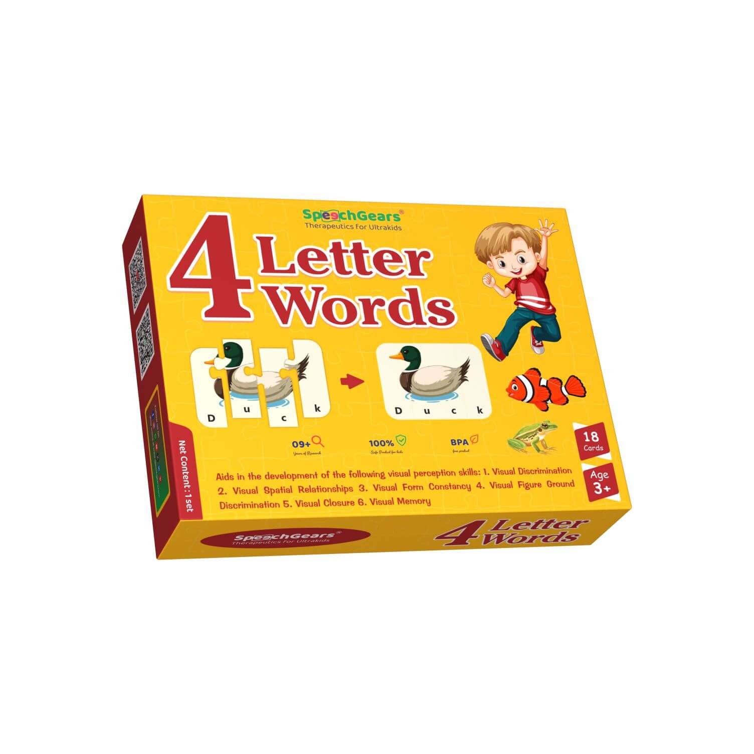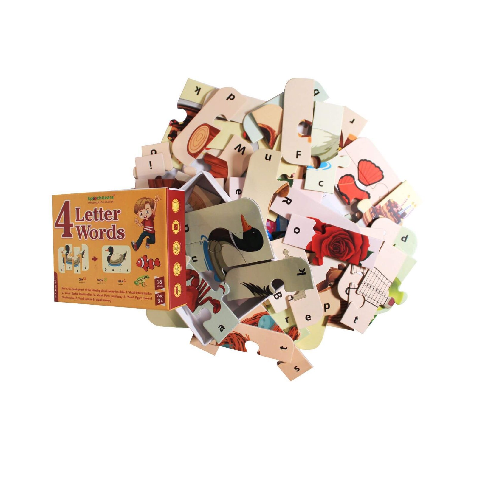 The SpeechGears 4-Letter Words Puzzle is a hands-on educational tool that reinforces early literacy, spelling, and vocabulary development through fun, interactive play. This box contains 18 four-piece jigsaw puzzles featuring familiar objects and their corresponding four-letter words. Each piece combines a letter with a portion of an image, helping children decode and spell words while connecting visual cues to language.